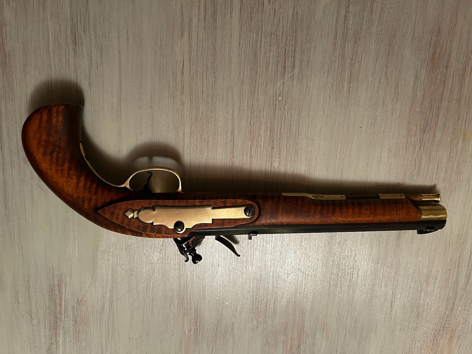 browned Siler Flintlock. The stock is a fine piece of curly maple stained a